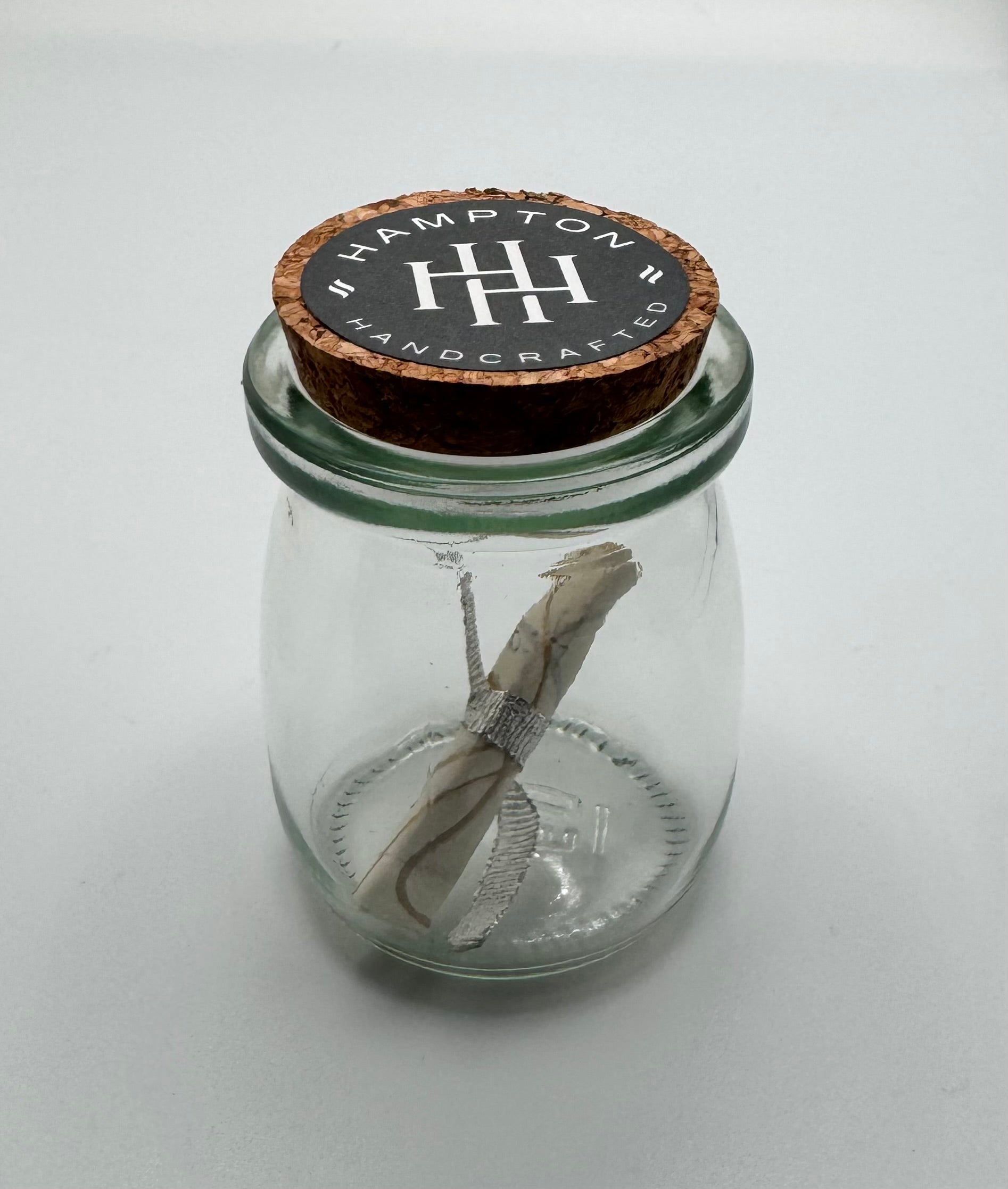 Introducing "Message in a Jar", a passion project created by my niece. Each 3oz jar contains a heartfelt handwritten message, contained by a cork lid, to brighten someone's day. All proceeds support her dreams.